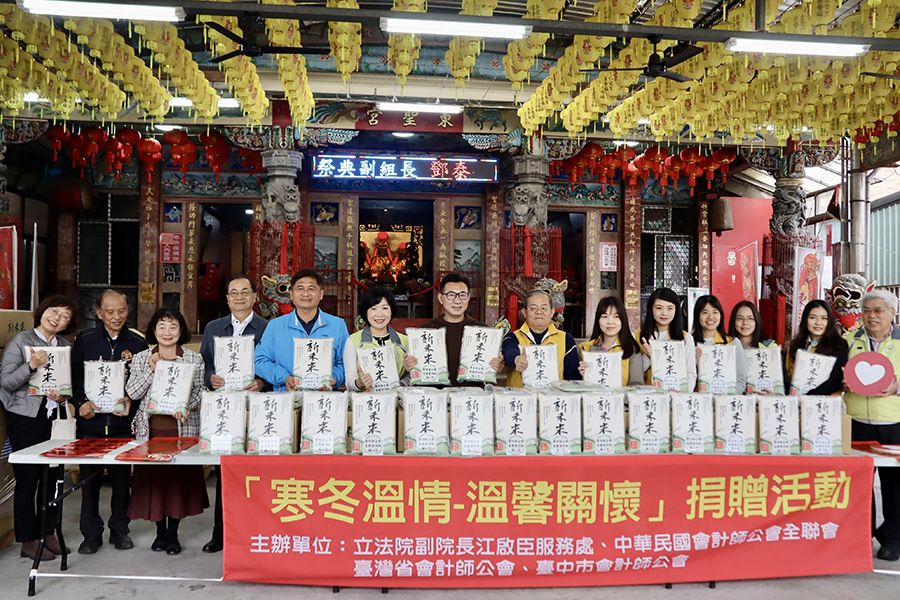 【記者彭勝郎台中報導】農曆過年春節前夕,立法院副院長江啟臣攜手中華民國會計師公會全聯會、台灣省會計師公會與台中市會計師公會,以及台中市議員吳振嘉、台灣新世代關懷協會於6日捐贈千包白米提供台中市大山城地區的弱勢民眾,期盼透過物資捐贈讓受贈者能解燃眉之急,填飽肚子過好年。