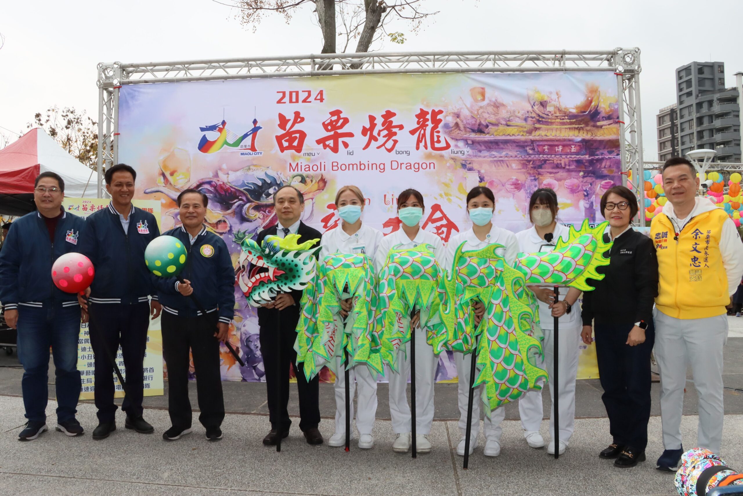 【記者林盈焜苗栗報導】即將迎來農曆新年,生肖交接即將迎接龍年,苗栗市公所6日上午在苗栗火車站西站舉辦2024苗栗(火旁)龍記者會,邀來苗栗市大千醫院婦產科醫師舞龍,象徵接生龍子龍女,婦產科「生育新龍」,引起民眾圍觀。記者會由苗栗市代理市長葉志航與苗栗縣副縣長鄧桂菊、立委邱鎮軍、議員余文忠、代表會主席陳仁杰及地方代表里長等共同出席盛會。