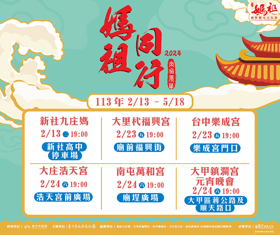 台中市文化局長陳佳君表示,市長盧秀燕上任以來積極推動四季盛典,打造台中城市節慶品牌。台中媽祖國際觀光文化節舉辦多年,邀請在地傑出團隊及全國優質團隊演出,讓國內外民眾透過表演團隊匯演,行遍台中媽祖宮廟,深刻瞭解媽祖信仰與在地文化。今年延續「媽祖同行」主題,將邀請超過30組優質團隊接力演出,歡迎民眾一同體驗結合藝術與宗教的文化盛典。