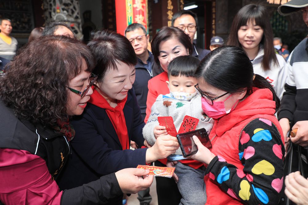 搶好彩頭!台中市長盧秀燕11日大年初二上午8時陸續前往大甲鎮瀾宮、清水紫雲巖、潭子得天宮參拜祈福,發送印有「龍珠許願」及「福運昌龍」祝賀詞的市長小紅包,一早吸引許多民眾排成人龍領紅包討吉利,並紛紛與盧市長合影留念,還有外縣市民眾特地起了大早來台中排隊領紅包。盧市長在各宮廟虔誠祈求國泰民安、風調雨順、市政昌隆,她並祝福市民健康快樂、闔府安康。