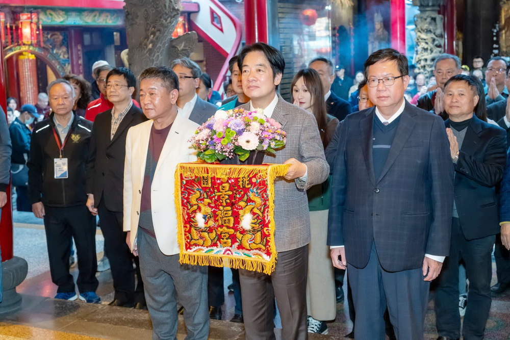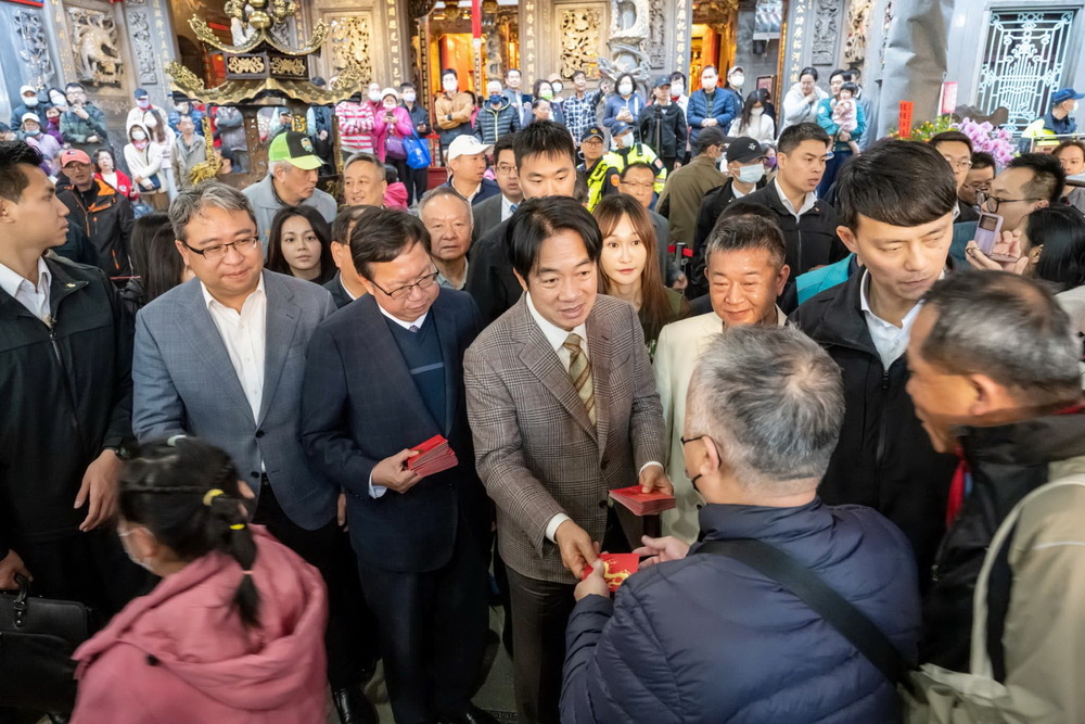 【記者鍾陽正桃園報導】副總統賴清德春節在行政院副院長鄭文燦、多位民進黨籍民代陪同下抵達桃園大廟景福宮參香祈福並在廟埕發放「龍年福袋」,吸引大批民眾到現場排隊,廟裡廟外全被人潮淹沒,都希望能拿到總統當選人賴清德親手發的福袋。當賴清德一下車,群眾就大聲高喊「總統好」,場面相當熱鬧。賴清德依傳統儀式進行三獻禮,祈求開漳聖王保佑國運昌隆和百業興隆,也保佑桃園四時無災、八節有慶,更祝福桃園鄉親新年快樂、事事如意,龍年行大運。大廟景福宮主任委員簡征潭、執行長李詩明暨全體委員監事均全程熱忱接待與陪同。