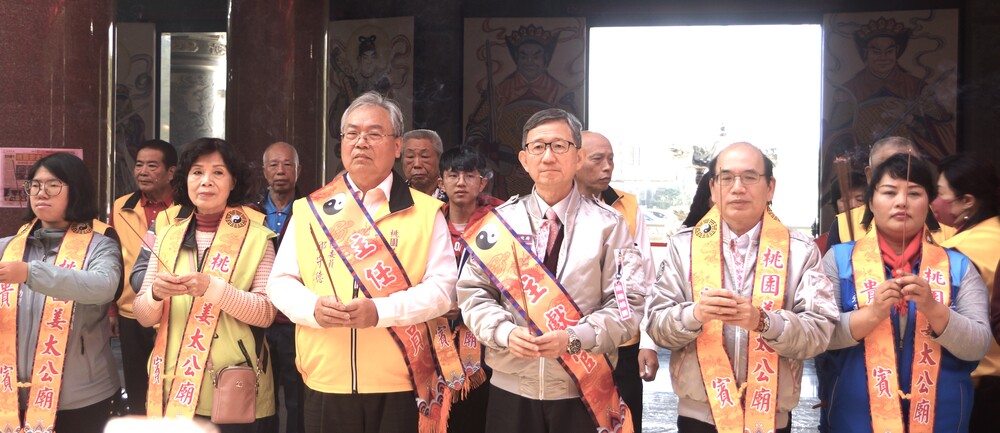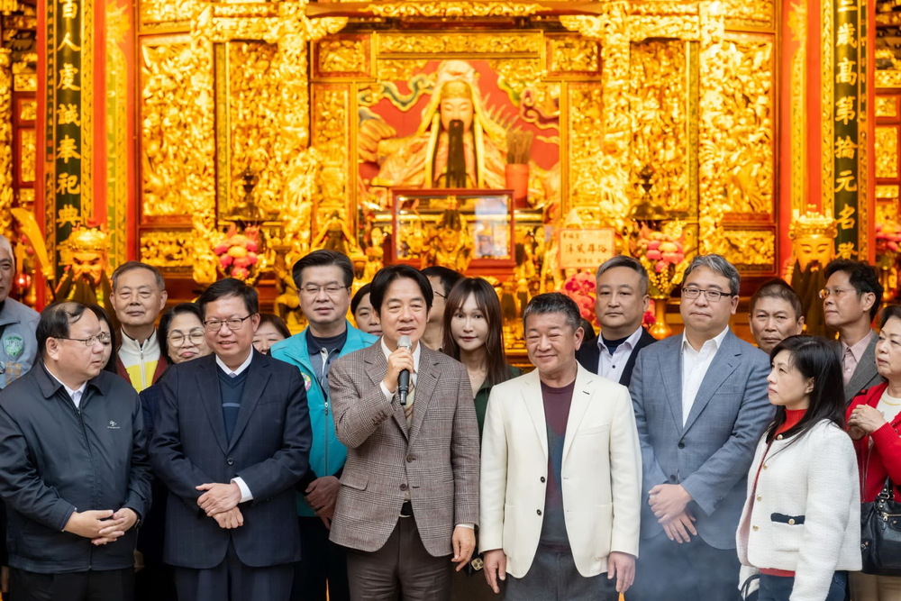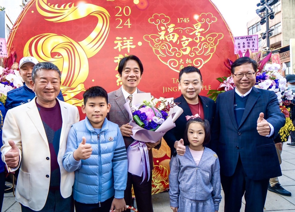 賴清德表示,很高興來到桃園景福宮參拜祈福。首先叩謝神恩,感謝開漳聖王保佑這場總統、立委大選,能夠平安順利成功,同時感謝父老鄉親鼎力支持,不僅對他的支持,也對民進黨推出5加1位立委候選人的支持,感激不盡,也要祈求開漳聖王大展神通,保佑台灣國泰民安、風調雨順,百業興隆,未來將會與副總統蕭美琴、國會及社會各界共同努力,讓台灣國富民強,讓社會愈來愈安定,人民愈來愈幸福,並祝福大家新的一年身體健康、事業成功、家庭美滿,龍年行大運。