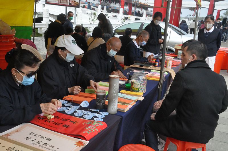 走春的香客絡繹不絕,一群穿著藍上衣白長褲的慈濟志工手持「蔬食環保護大地,資源回收惜物命」舉牌,穿梭在人群中推動蔬食環保共善,期望更多人響應素食愛地球,讓地球「沸騰」退燒,同時淨化人心。