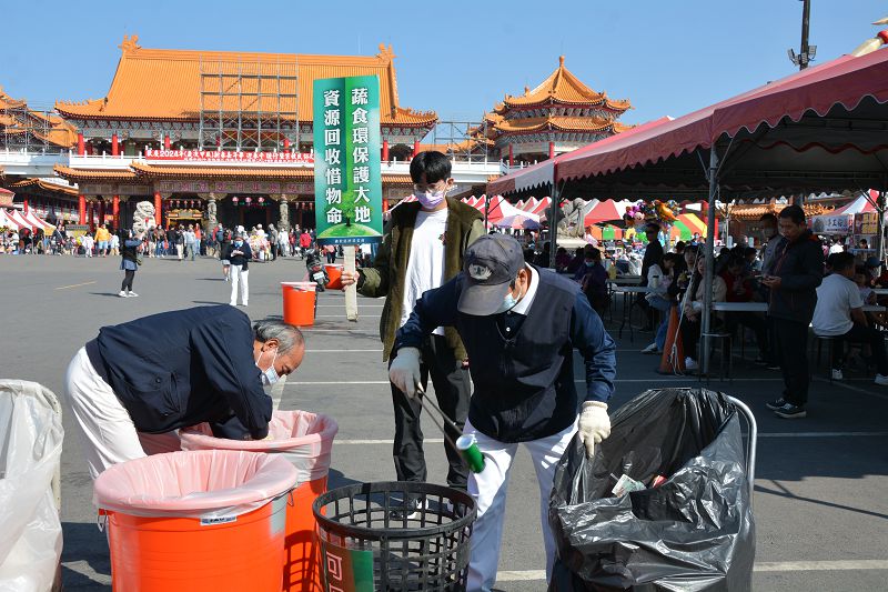 改善以往缺失落實信眾能主動,正確做好資源可回收讓垃圾減量,廟方認同環保分類精神,配合志工提供回收桶,志工在桶身貼上「可回收」標誌,在每個可回收桶內先放入幾個寶特瓶、擦拭乾淨餐盒、飲料杯做示範,跟一般垃圾桶做出區別。眼睛逛市集吃完東西低頭再丟就不再看錯。