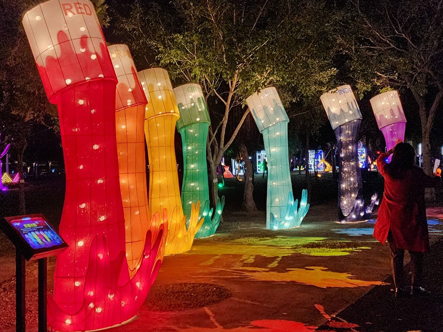 台中市教育局長蔣偉民表示,為打造適合闔家同遊、拍照打卡熱點,教育局精心打造「小小Backpacker賞燈趣」燈區,燈區設有「奇幻傳送門」、「神奇魔法書」、「彩繪光影」、「STEAM開箱」、「Fun閱全球」、「築夢王國」等6座絢麗奪目的燈組。