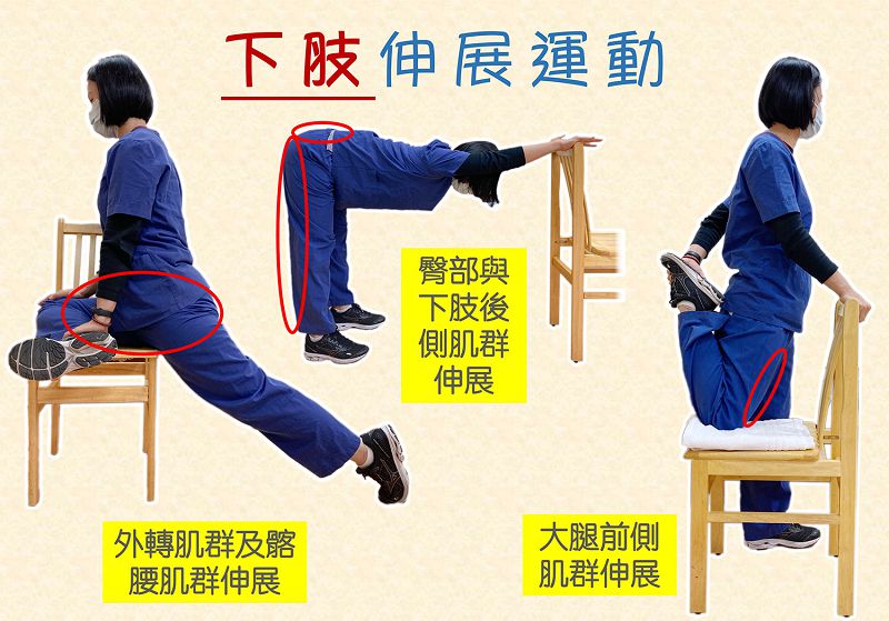 遠離久坐,站起來動一動。復健醫學部物理治療師林秀玲教您可以使用一張椅子搭配三個下肢伸展運動。首先是「外轉肌群及髂腰肌群伸展」:左腳向後伸直,右腳前彎曲支撐在椅面,上半身及骨盆朝正前方慢慢往前趴,停留五到二十秒,須雙腳交換重複五次。其次是「臀部與下肢後側肌群伸展」:雙手輔靠椅背,雙腳後退,臀部慢慢向後延伸,上身挺直與下肢成九十度,停留十到二十秒,放鬆後重複施做五次。最後是「大腿前側肌群伸展」:椅面鋪毛巾,左手支撐椅背,右膝蓋支撐椅面維持平衡,上身挺直、骨盆朝前,右手抓右腳踝處往臀部方向加壓,停留五到二十秒,雙腳交換施做重複五次。