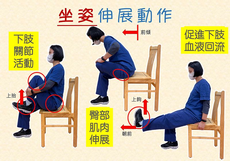 林秀玲物理治療師如果活動空間有限,也可直接坐椅子施行三個坐姿伸展。第一個是「下肢關節活動」:抬起膝蓋,雙手抱住小腿往身體靠攏,腳尖上抬,停留二十秒換腳重複十次。第二個是「臀部肌肉伸展」:單腳翹起,腳踝放置另隻腳膝蓋上,上身挺直前傾,臀部後外感覺側繃緊時,停留十到二十秒,換腳重複十次。第三種是「促進下肢血液回流」:雙手抓握椅側穩定上身,抬小腿,腳踝轉向前腳間朝前,腳踝轉向上鉤腳尖朝上,順時及逆時鐘旋轉腳踝,做二十次後換腳重複五次。