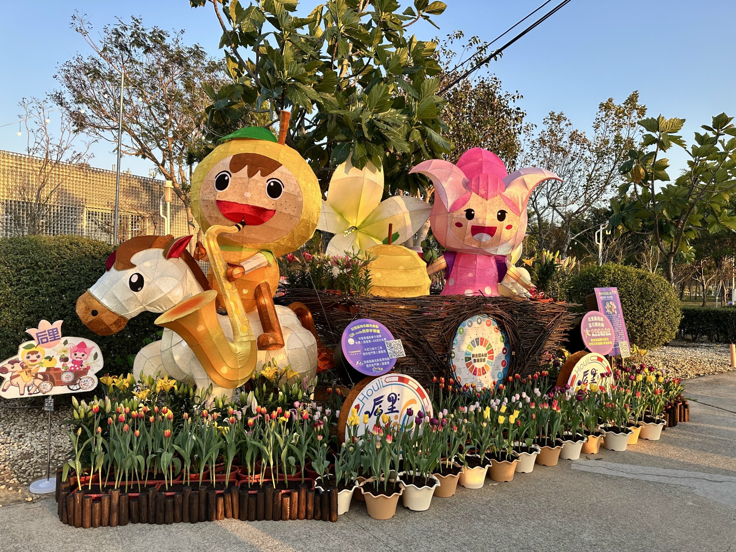 賴區長指出,后里區自然景色優美氣候宜人,是全國重要的花卉和水果產地之一,后里本次燈座是由最佳代言人「梨寶」及「花妞」騎著馬場的駿馬、吹著薩克斯風、品嚐著葡萄美酒,還有豐收的高接梨及百合花,特別再以廢棄梨梗所組成馬車,加上周圍鬱金香、百合花、海芋等特色花卉,再強調呼應出SDGs目標,呈現出樂音、農產與大自然同頌的花果特色。歡迎鄉親相揪來賞燈!