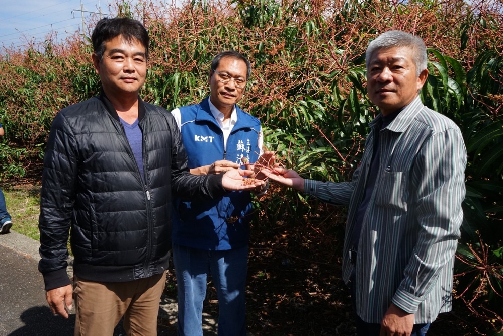 蘇清泉偕枋山代表會主席洪啟能,農會理事長戴正一及總幹事陳德慶前往勘災,農友現場展示,扶著開花結果中的樹枝只要稍微輕搖一下,樹枝上小花、結果即紛紛掉落。一年只靠一季採收的芒果因天候因素,遇上病蟲害大爆發,農民心急如焚,焦慮全寫在臉上。