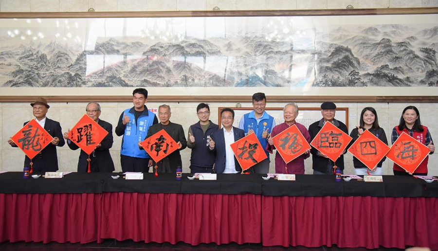 【記者陳良安南投報導】新春伊始,縣府文化局17日上午在該局戶外廣場舉辦「2024祥龍瑞氣新春文薈」活動,26位縣內書畫大師雲集,在文化局長林榮森與多位大師開筆,一起揮毫寫下「龍躍南投福臨四海」的祝福,藝文界以文會友,和民眾共同迎新。