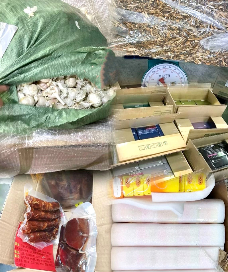 112年基隆關緝獲中國大陸大蒜、香菇、加熱菸、香腸、電子煙等走私品。(基隆關提供)