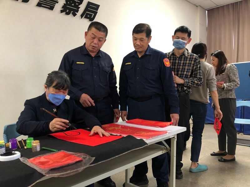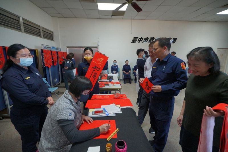 慈濟志工以柔性的手語帶動,並邀請臺中慈院中醫部蕭士育醫師,為公務繁忙的員警分享健康講座,讓他們身心得以短暫紓解。現場還有南區長青學苑的五位老師,即興揮毫寫春聯,分送給警察弟兄應景。張張紅色春聯,句句都是吉祥好話,讓同仁們感受到滿滿的龍年新春氛圍。