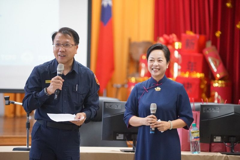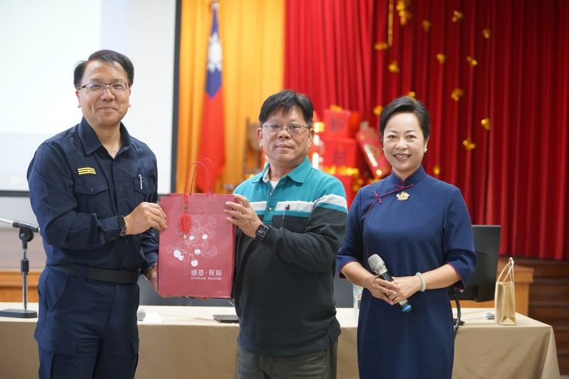 慈警工謝美珠與沈中益帶領二十位慈警志工,送上蘋果、點心和平安吊飾,祝福八十位在座的波麗士大人,平安健康。