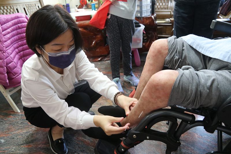 此路線首先關懷住在朴子的案主陳先生,主責的楊紓怡中醫師首次來到陳先生家,熱情地和案家打招呼,案主之前怕針灸,自從上個月針灸之後已不再俱怕,這次在楊醫師的「望、聞、問、切」用心地診脈後,下針既快又準,楊醫師問:「會痛嗎?」案主說:「不會!」不一會兒的功夫,案主頭上、手上、腳上已扎滿針,案主卻也已不怕針灸。