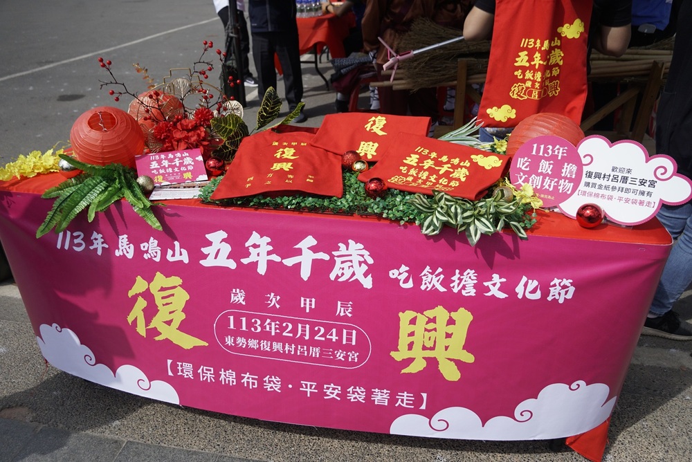 東勢鄉復興村村長張文發表示,復興村十五年才輪值一次,村民總動員,現場將準備各種美食如羊肉湯、油飯、炒米粉、肉包、肉羹、鹹菜鴨等,要讓參與者吃得開心!今年還推出「文創帆布袋」贈送活動,歡迎到復興村呂厝「三安宮」參拜,即可獲得一個文創帆布袋,數量有限,送完為止。