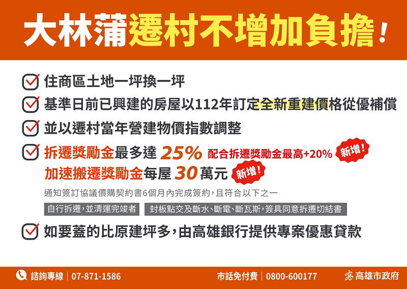 市府考量近年建築成本大幅上漲,極力向中央爭取大林蒲遷村住商區土地一坪換一坪、建築物補償費採112年評估的全新的重建價格補償,再加計遷村當年營建物價指數調整以及拆遷獎勵金等多重配套,可讓民眾遷村後蓋回原房屋建坪與建材,不會增加負擔。倘若居民想用更好的建材或蓋更多建坪,有資金需求,市府也協調高雄銀行提供專案優惠貸款協助。而非住商區土地則以高於市價4成給予補償,農業區地主也可選擇以優惠的條件交換高坪特定區的住宅區土地;多樣化的方案與配套,體現市長再三強調落實大林蒲居住權、財產權及社會權的保障。
