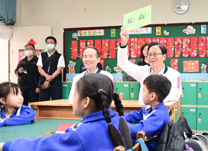 張善政首先和與會貴賓一同了解「智慧廚房監控系統」及「電子巡檢系統」實際應用情形;隨後,與學生一起參與營養教育課程,並一同享用營養午餐,今日大竹國小提供多樣美味菜餚,包含糙米飯、瓜仔肉燥、奶香起司南瓜、有機山茼蒿、紫菜蛋花湯及國產桶柑,學生們吃得津津有味,臉上洋溢著幸福與滿足。