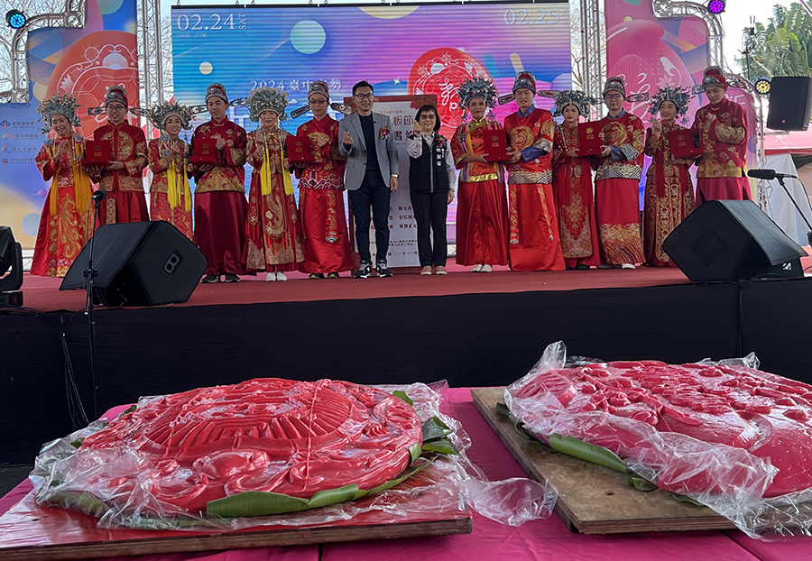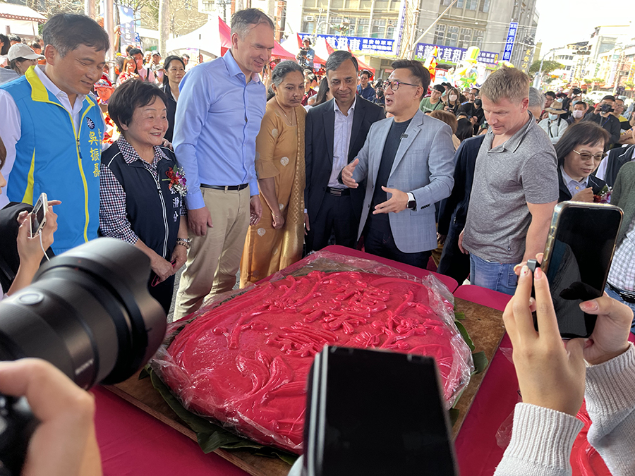東勢新丁粄節今最特別的是,立法院副院長江啟臣特別邀請四國駐台使節出席到場參加民俗慶典,史瓦帝尼王國、立陶宛、印度等多國代表出席;以及市府民政局配合六對新人參加開幕活動,現場喜氨氣洋洋。
