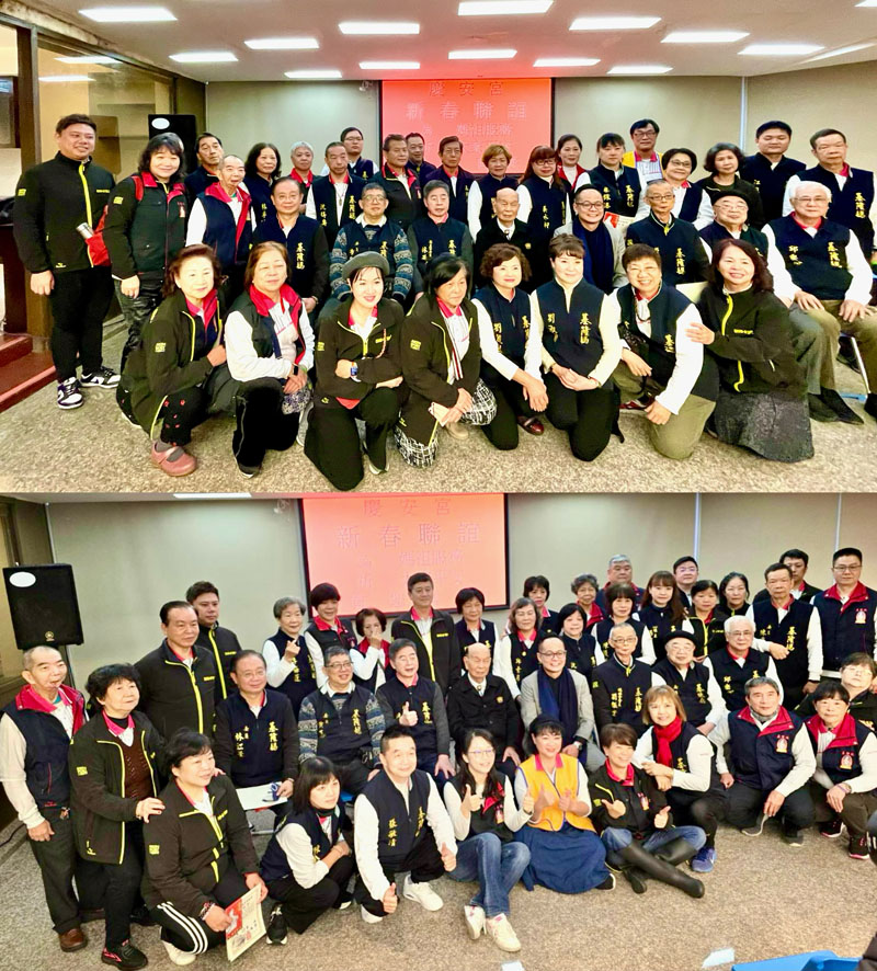 「慶安宮」全台唯一敬奉湄洲媽、泉州媽、漳州媽之媽祖聖殿,緣起清乾隆45年(西元1780),距今245年歷史。童主委表示,藉著一年一度新春團拜,協同委員們及媽祖會長劉振堂向義工們鞠躬致謝;讚揚「甲辰義工表揚大會」,總幹事張如松帶領熱場「吉祥操」等歌曲,真正揪厲害用「比」的帶動唱聯誼。感恩會員在劉會長、副會長、兩位總幹事張如松、陳見興帶領下,積極參與廟務;新春期間,更是日夜分組輪值令人感動,媽祖靈感慈悲,祝大家身體健康、萬事如意!