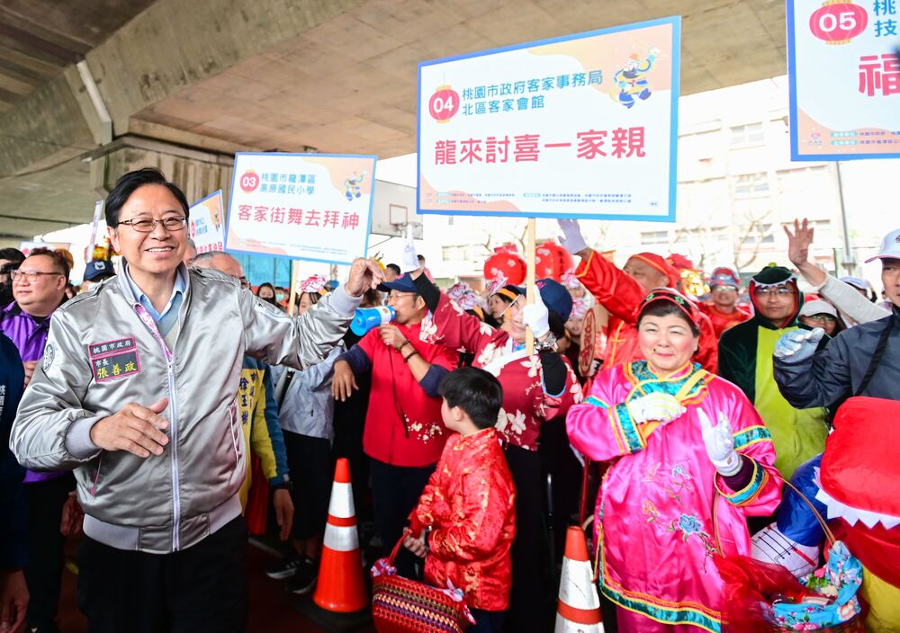 【記者吳世傑桃園報導】桃園市長張善政日前在市議員徐玉樹、張肇良、劉熒隆、市府客家局長林昭賢、龍潭區長黃世琪等人陪同下,前往龍潭區出席「2024桃園龍潭迎古董接財神-踩街嘉年華活動」。