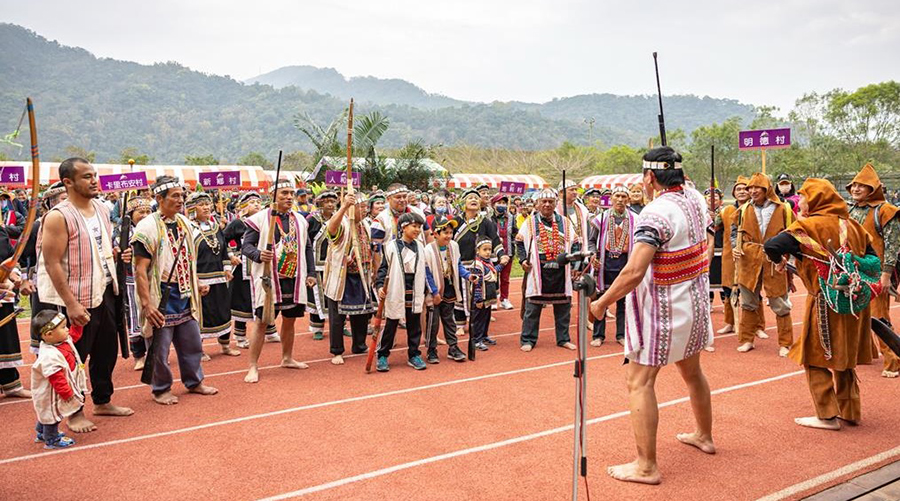1.信義鄉運動會暨歲時祭儀活動,部落族人扶老攜幼身著傳通服飾,展演布農族射耳祭祭儀。