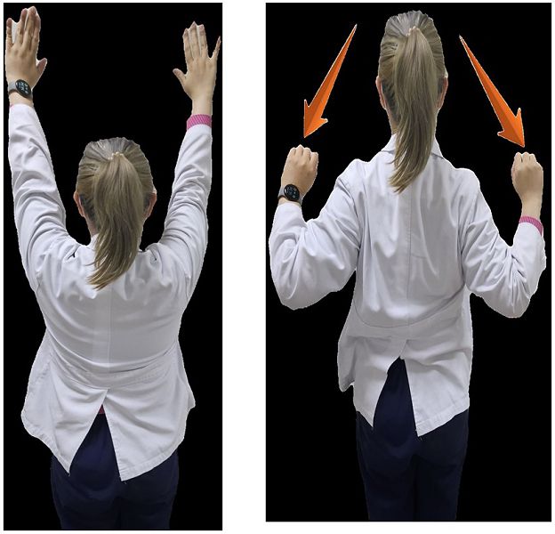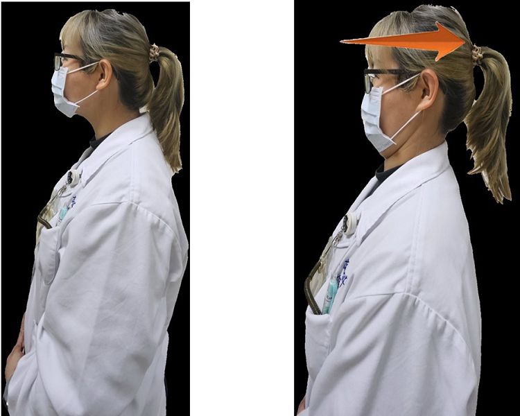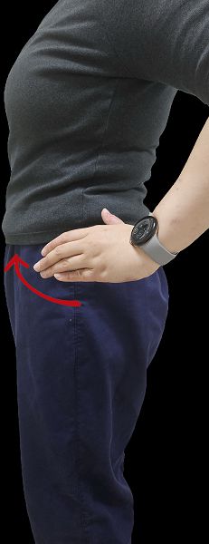 第一招:雙腳站立與肩同寬(若無法維持站姿可坐於有靠背的椅子上)以肩膀為中心畫圈,盡量畫大圈且速度放慢,以五秒畫一圈,順時針及逆時針各五圈,活化肩關節及肩頸肌肉。第二招:吸氣時雙臂上舉,吐氣時手肘彎曲往下拉,與身體形成W的形狀,挺胸收下巴,維持五秒,重複吸氣上舉雙臂,可重複五到十次。第三招:維持收下巴,額頭往後腦勺方向推,使耳朵對齊肩膀正中間,不要聳肩,想像脖子延伸使肩膀離開耳朵,停留十秒,重複五到十次。第四招:雙手叉腰,四隻手指在前大拇指在後,下腹部出力收緊,雙手扶住骨盆向後轉,想像骨盆像是個杯子,而雙手拿杯子喝水一樣讓骨盆往後傾斜。前後交替,配合呼吸,重複十到二十次,可慢慢增加旋轉的角度。第五招:雙腳站立與肩同寬(若無法維持站姿可坐於有靠背的椅子上),腳跟輕輕離地,踮起腳尖,在保持平衡下維持十秒,放下腳跟,重心移到腳跟,腹部收緊,勾起腳尖維持十秒,交替十次。
