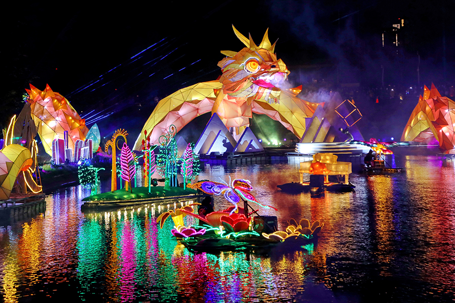 市府觀旅局長陳美秀說明,此次由觀旅局、民政局、建設局、教育局、農業局5局處共同打造8大主題燈區,區區皆有不同特色,許多民眾都表示「顛覆傳統燈會既定印象」,不只首創水上劇場的主燈秀,還加入許多互動性的科幻燈組及大玩KUSO的燈組。