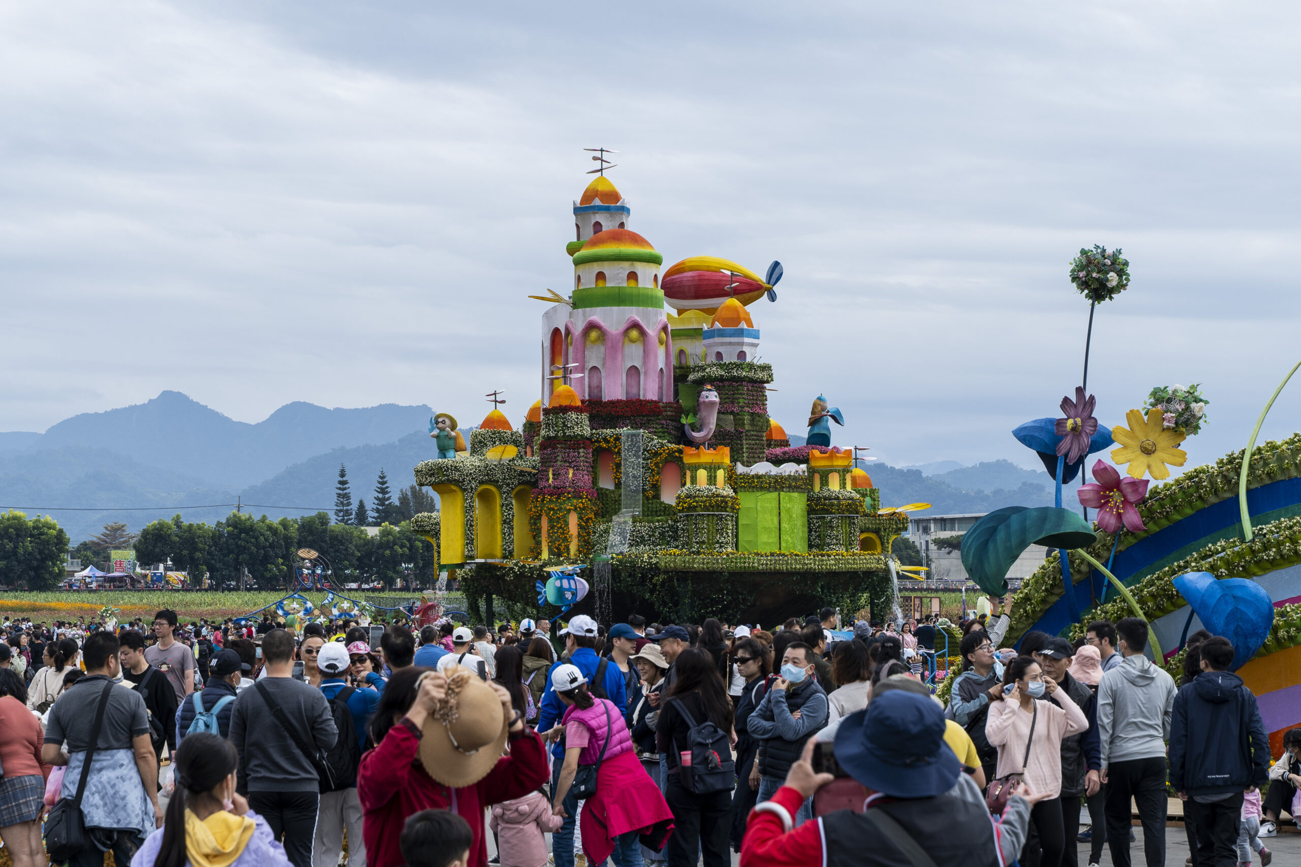 觀旅局表示,2023台中國際花毯節以在地元素的自然生態、農業發展、人文智慧為設計主軸,描繪出花都三大守護神,呼應新社為真實版的夢想國度,主花毯「漂浮花都」更突破以往規模,結合花卉種植技術與機械動態機關製作成大型立體花毯裝置,高度達史上最高16米5層樓高,並運用強力水霧技術及泡泡系統,使整座花卉城堡有如飄浮起來華麗登場。