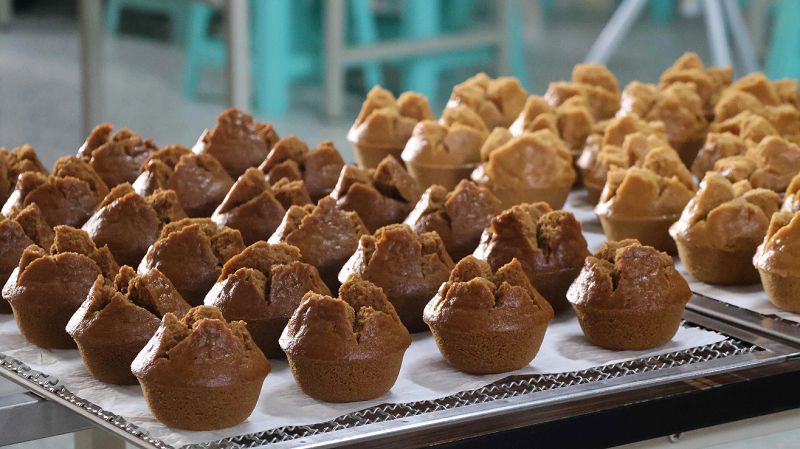 出爐後的發糕,要脫模、包裝,原本以為一天的工作就結束了,然而細節中見證常住師父承襲惜福勤儉的靜思家風。