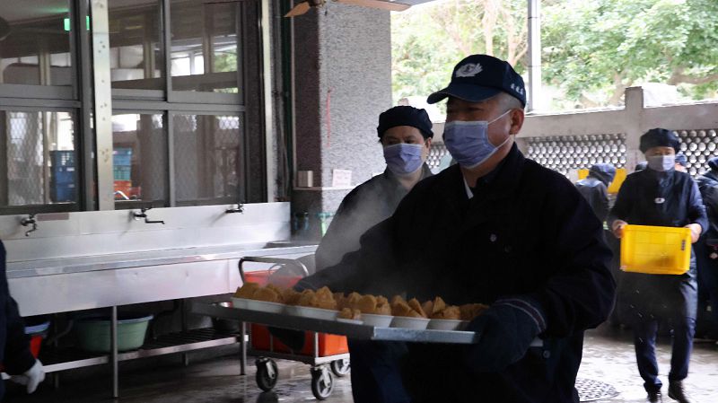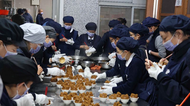 在惜福糕推出的最後一天,適逢靜思精舍的冬令發放日。2月2日這天,渙師父就推出甜品糰子串和日式照燒糰子串兩種口味,有鹹有甜任君選擇。志工們在揉製糰子串的時候,路過的常住師父說:「看著堆疊的丸子串,好療癒喔!」