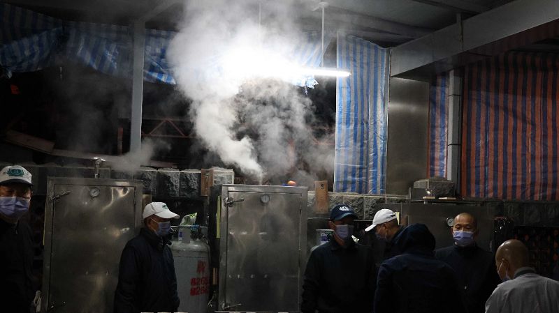 每天的第一爐(常住師父稱「一車」)發糕,在清晨五點五十分出爐,熱騰騰的白煙雀躍的從蒸籠中冒出,在夜色中分外顯眼。戴著隔熱手套,端著不銹鋼蒸籠的師兄,將熱到冒煙的發糕整盤端上桌讓它冷卻,再由志工進行脫模。