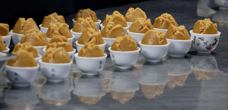 常住師父與志工在前一天晚上八點半先洗米、泡水,第二天清晨三點多就起來瀝水、磨米、調製發糕漿。發糕漿倒入小瓷碗,擺上方形不銹鋼蒸籠後,再放進蒸爐,三個蒸爐每隔十五分鐘依序啟動。大約四十五分鐘後,就能見到各個發糕在蒸爐裡「開口笑」了。