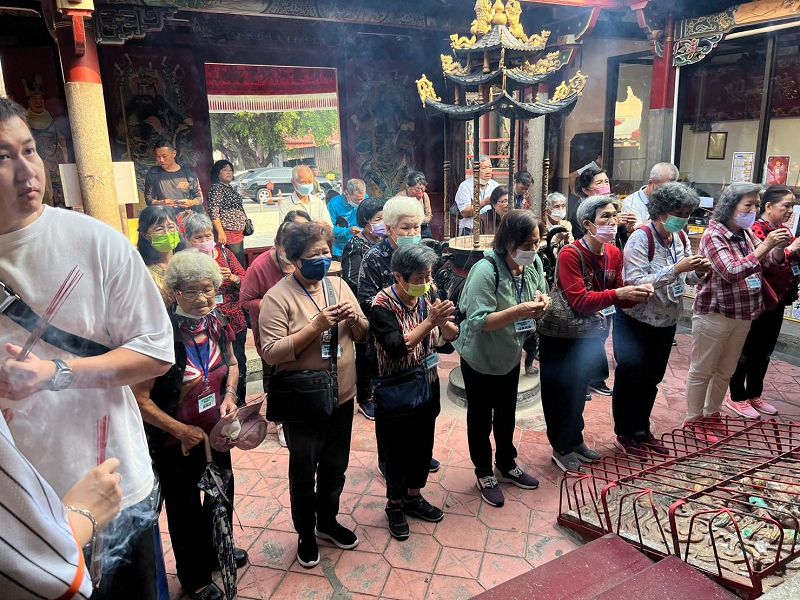 「旗山天后宮」是最後一站,長者虔誠參拜並祈求健康平安,還讓長者觀察天后宮的建築特色,將林世明老師上課內容化成生活體驗。子晴求了一個要給秀桃阿嬤的平安符:「有一次阿嬤住院請假,我去家中訪視關懷時,發現阿嬤座椅旁邊有掛一個護身符,阿嬤沒時間拿去廟裡過香爐,剛好這次來天后宮所以幫阿嬤求一個平安符,幫阿嬤掛在身上
