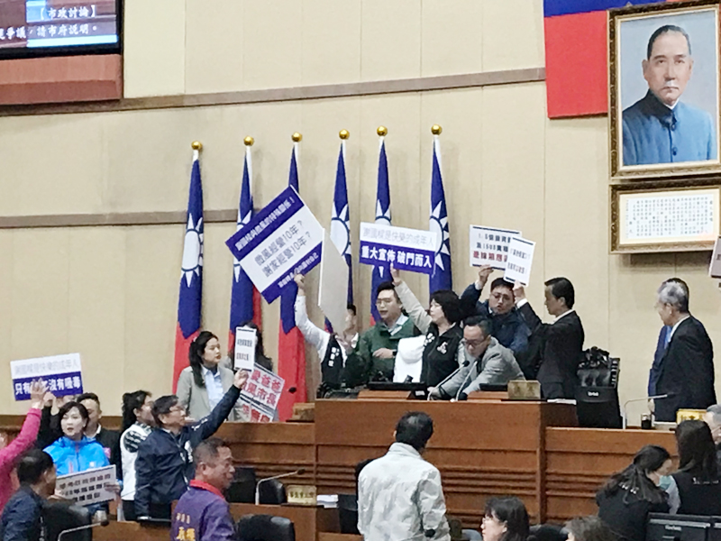 雙方搶奪手牌 從主席台上鬧到台下議場 藍綠陣營議員各喊各話 誰也不服誰