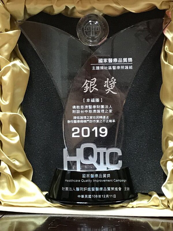 台中慈濟護理之家喜事成雙,「降低護理之家住民,轉運送急性醫療機構門診作業之不正確率」措施繼獲得SNQ標章後,又榮獲第二十屆HQIC國家醫療品質獎銀獎,十一日在台北卓越堂受獎。衛福部主秘鄭舜平勉勵得獎的各大醫院以及照顧機構,隨醫療進步,未來大眾對品質提升會有更大的憧憬,需要各醫院及機構嚴格控管,打造更卓越的醫療品質。