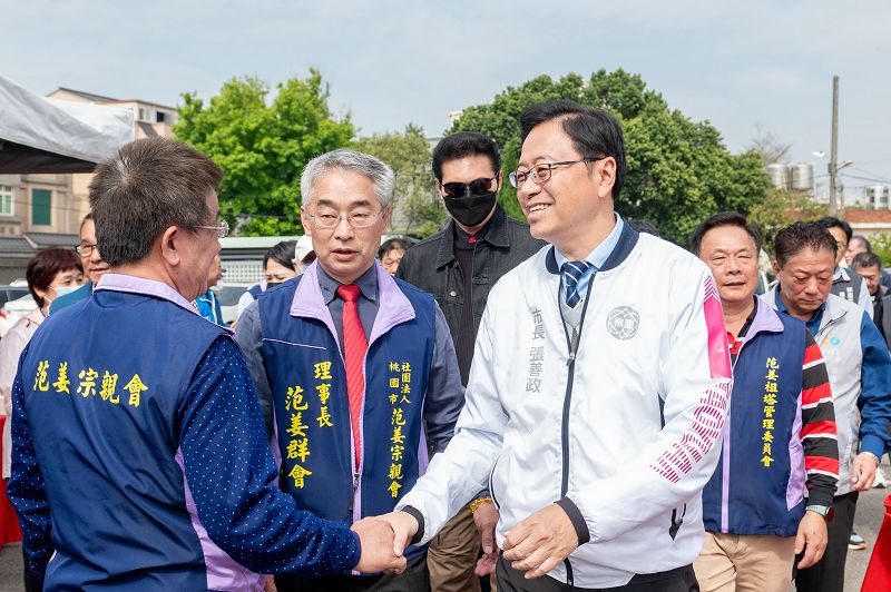 【記者徐玉英桃園報導】桃園市長張善政日前在立法委員涂權吉、市議員陳睿生、市府文化局長邱正生、客家局長范姜泰基、社團法人桃園市范姜宗親會理事長范姜群會等人陪同下,前往新屋區出席「桃園市市定古蹟新屋范姜祖堂景觀及排水改善工程」開工祈福典禮。