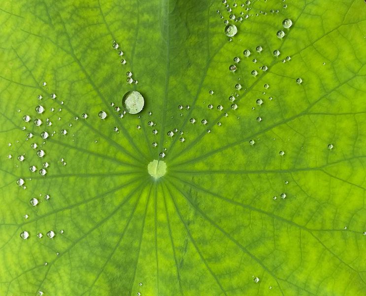 荷葉葉面因含有蠟質及奈米級的毛狀結構,疏水性極強,落在上面的水會自動聚成水珠,水珠滾動時就順便把塵土滾出葉面,所以葉面始終乾淨無塵,葉面上水珠閃閃發亮,乾淨、清澈。
