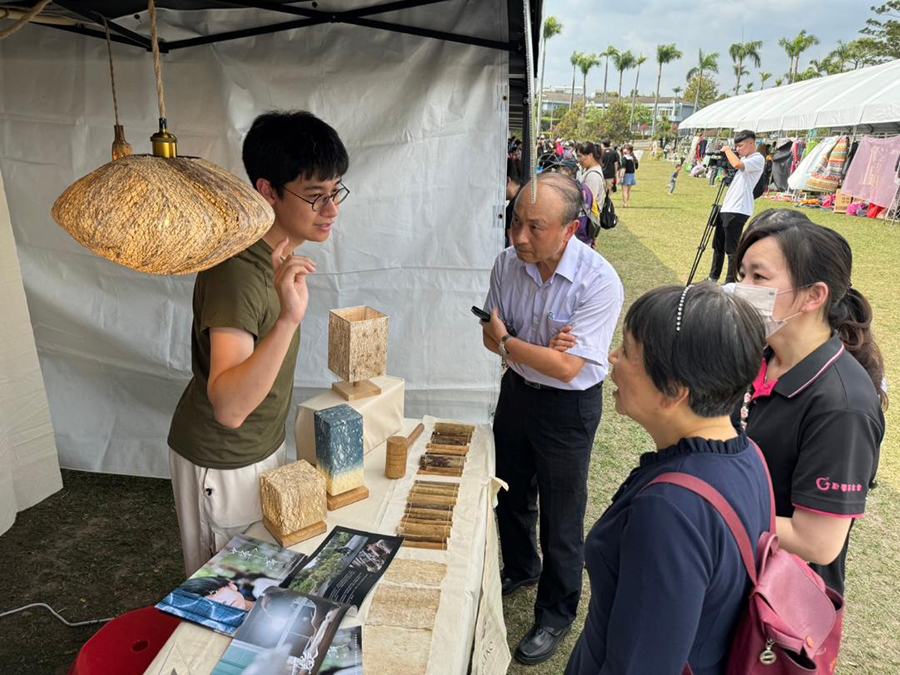 這次活動特別邀請到草屯鎮碧峰社區楊玉平執行長及中寮鄉「中寮之藝」創辦人—小也,以展覽的方式,向民眾分享如何利用回收物以及天然植物,創造綠色經濟,並成功打造出永續善循環的故事。現場除了分享他們投入綠色行動、如何創造在地社會福祉,達到地方創生的過程,更有回收物再生童玩,以及樹皮纖維工藝品展示。透過綠色創業的故事,讓社會大眾了解綠色行動在日常生活中的各種可能及影響力。