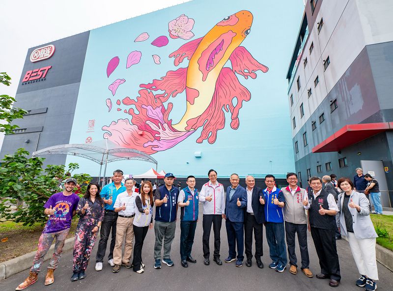 【記者吳世傑桃園報導】桃園市長張善政日前在市議員吳進昌、許更生、桃園市觀音工業區廠商協進會理事長蔡秋雄、市府工策會執行長王智弘、新光鋼鐵股份有限公司董事長粟明德、華裔藝術家Karen Sue Chen陳潔敏等人陪同下,前往觀音區出席「桃園觀音工廠外牆塗鴉新樣貌活動」。