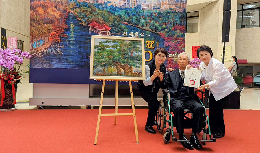 【記者張原銘、張皓傑台中報導】平時執手術刀行醫的醫師,也執畫筆紀錄臺灣之美。臺中市政府文化局即日起至5月15日於大墩文化中心舉辦「歌頌寰宇~趙宗冠90創作特邀展」,展出90件描繪臺灣風光的精采創作,其中2幅更是以多幅小品集結而成的巨幅500號作品,並獲醫藝兼備的趙宗冠博士慷慨捐贈典藏作品「五葉松蔭(臺中市市樹)」。臺中市長盧秀燕也出席開幕式表達祝福與感謝,並邀請民眾把握機會前往欣賞。
