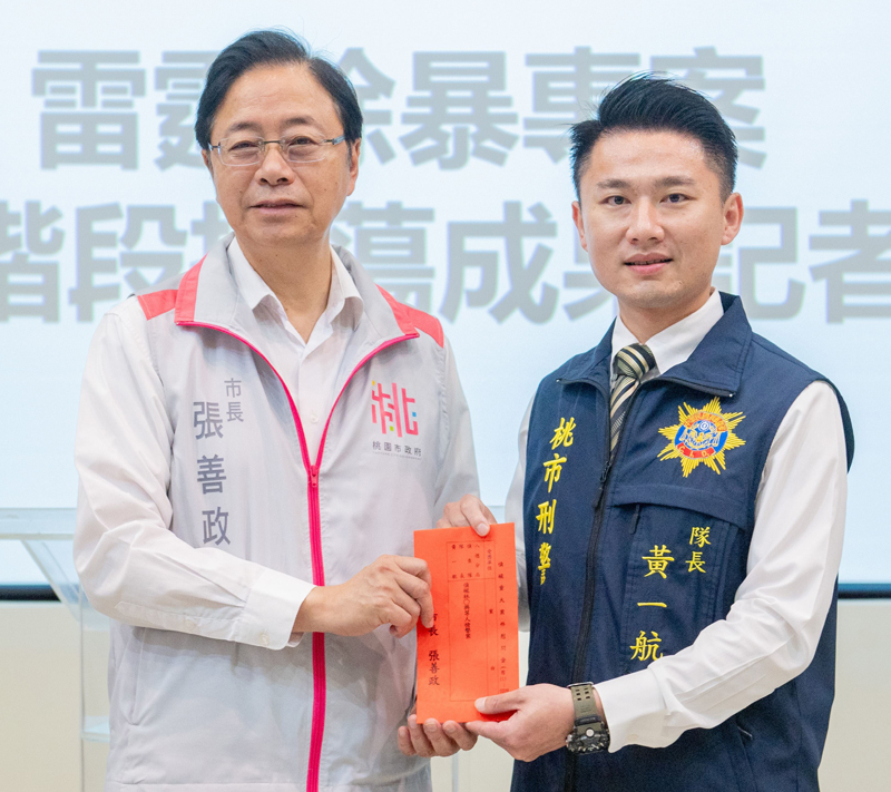 張善政表示,3月23日有嫌犯於本市開槍襲擊派出所,並引發警匪槍戰,警察同仁於半小時內即將匪徒緝捕到案;市府警察局並隨即啟動「雷霆除暴專案」,針對轄內治安顧慮場所進行強力掃蕩,查緝非法槍械、毒品、詐欺集團及幫派份子,成果豐碩,感謝警察同仁的辛勞,有效維護桃園治安環境。