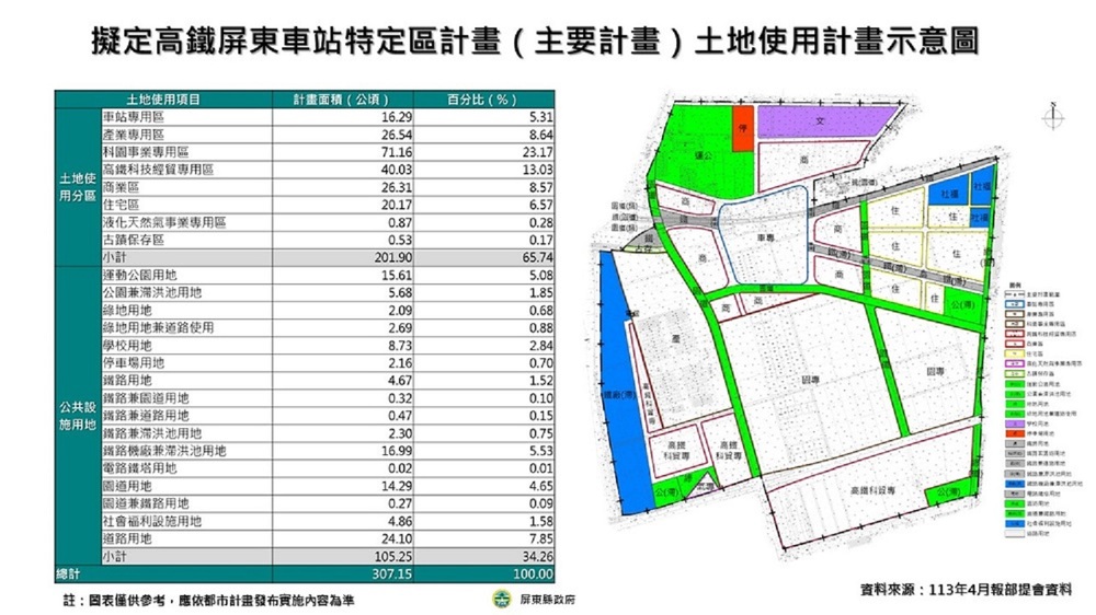 屏縣府表示,新訂都市計畫以高鐵屏東車站為核心,結合周邊先行開發建設之屏東縣運動休閒園區、屏東科技產業園區(擴區)、南部科學園區屏東園區及屏科實驗中學作空間規劃整合,未來將作為串聯南台灣高科技廊帶關鍵地區,加速帶動「屏東星特區」發展產業新聚落,帶動產業多元發展及轉型,加速創新,提升城市競爭力。