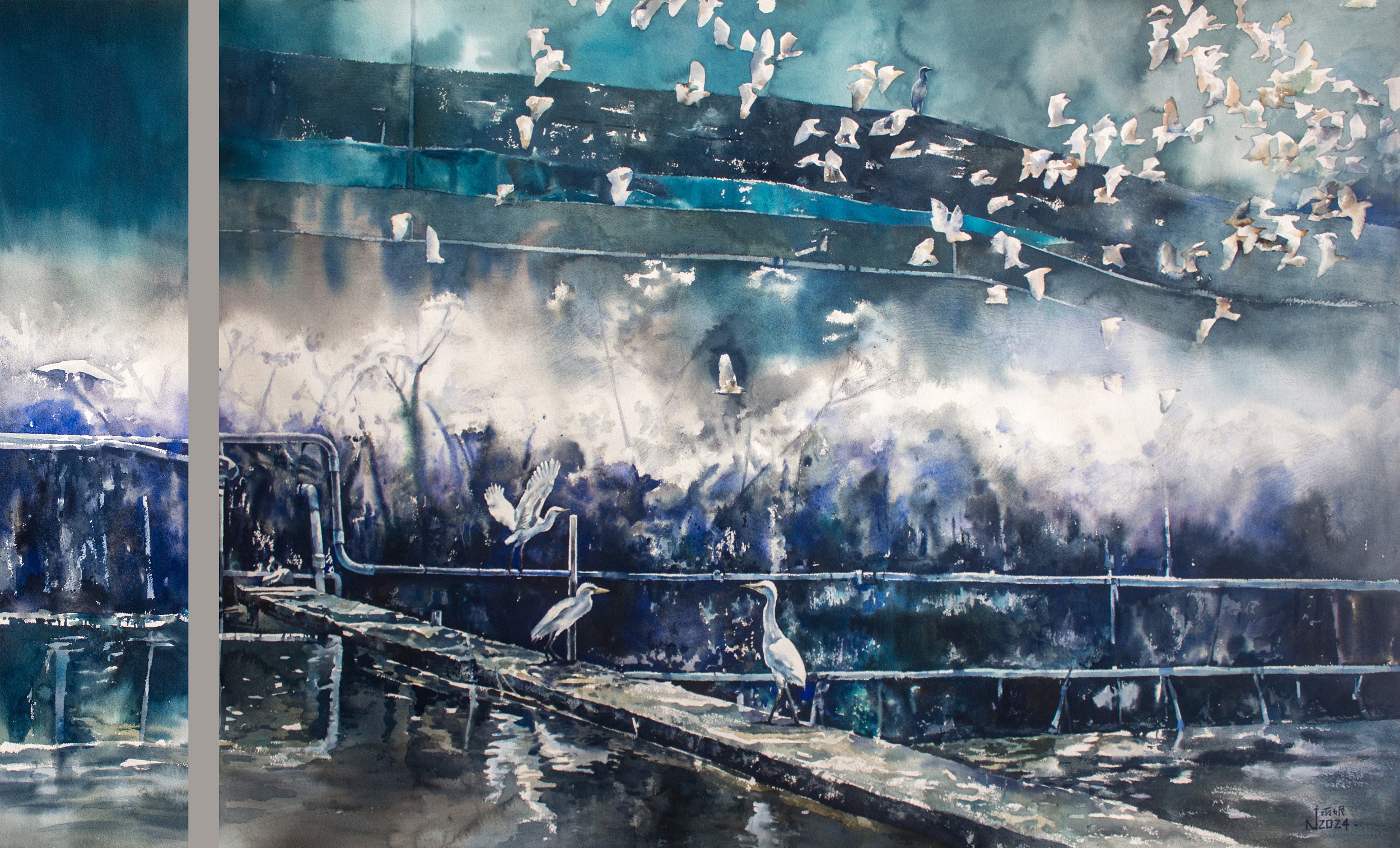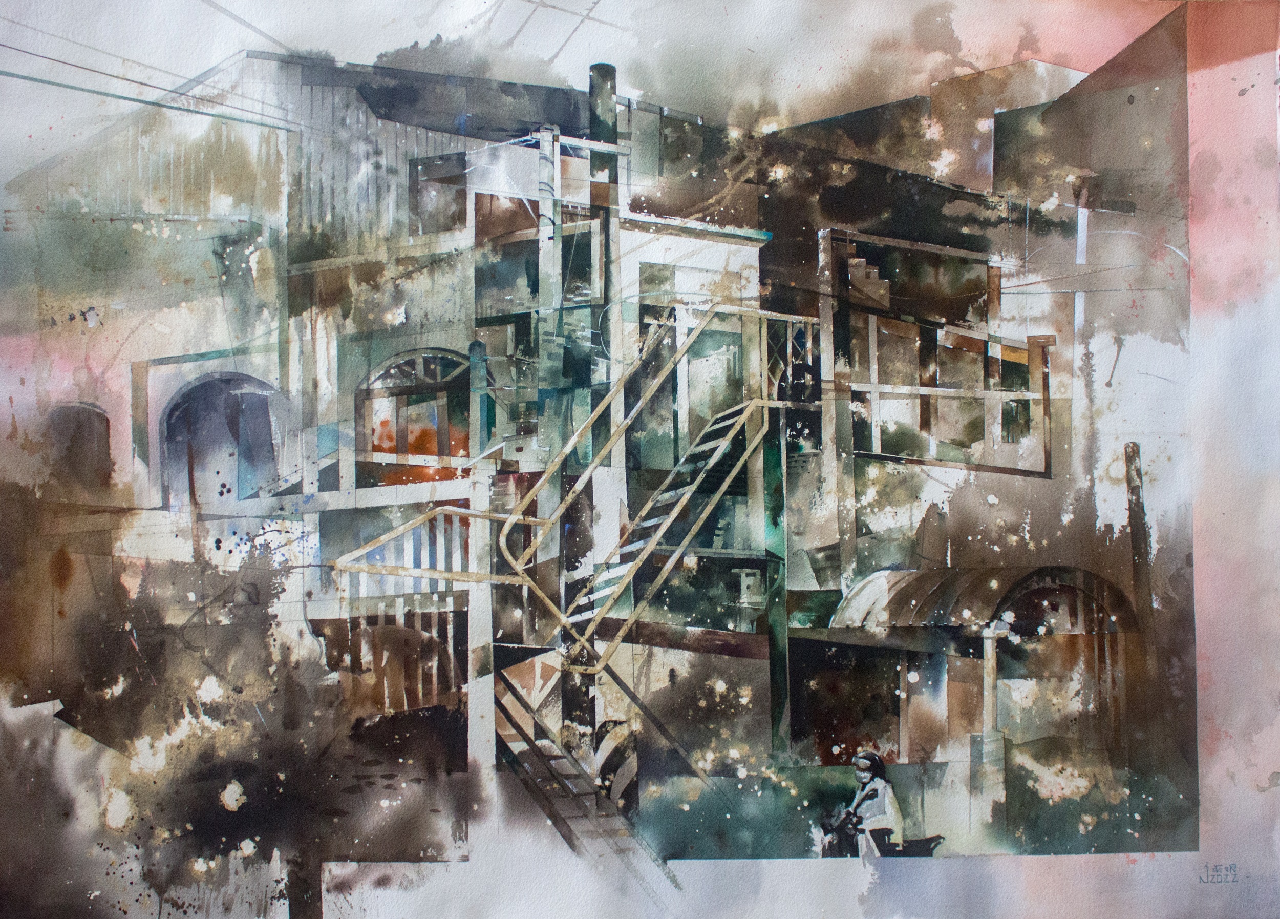 水彩畫家邱巧妮以獨特且擅長的大面積水份渲染的流動軌跡,將生活、回憶中的空間場景轉譯融入作品《留住泛黃的記憶》,透過強烈視覺對比及構圖,打造色彩斑斕的藝術世界,觀眾帶來一場視覺盛宴。