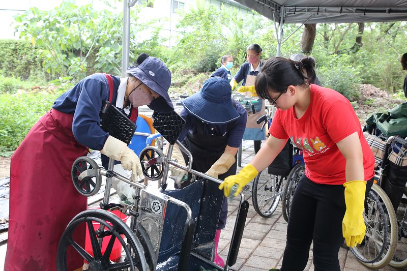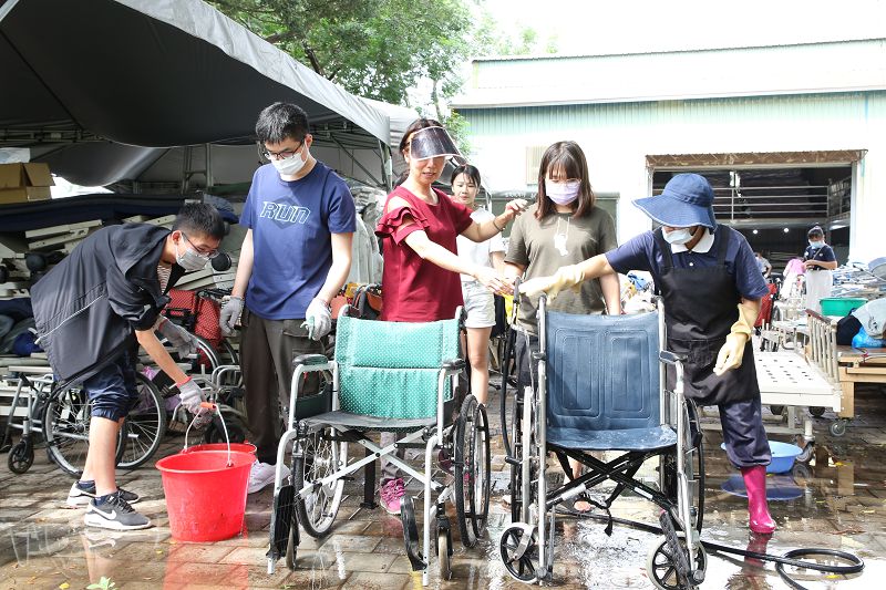手拿水管仔細的清洗輪椅,被安排在「清洗組」的女學生們挽起褲管,有的有備而來穿著雨鞋,帶著塑膠手套,拿著菜瓜布仔細地清洗,一下子閃亮的輪椅已清洗乾淨,送到陽光底下晾乾。