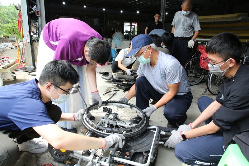 慈濟嘉義輔具志工將與會同學區分為「維修組」和「清洗組」,車輛系的男同學都來學習修理輪椅,觀光休閒管理系的女同學到清洗組。