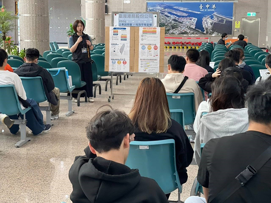 台中港務分公司知道能讓員工具有幸福感、歸屬感的企業,才是新鮮人的首選,近年內積極參與中部校園徵才就業博覽會,並在各大專院校學生來港區參訪時舉辦企業說明會暨性別平等宣導,同時推廣性別平等理念,積極強化公司在消除職場性別歧視的推動,想讓新鮮人知道公司在幸福企業的積極作為及推動,歡迎有志於加入港務大家庭的求職者,深入了解港務公司文化和工作機會,與該公司一起共創未來,在港務大家庭實現職業理想。