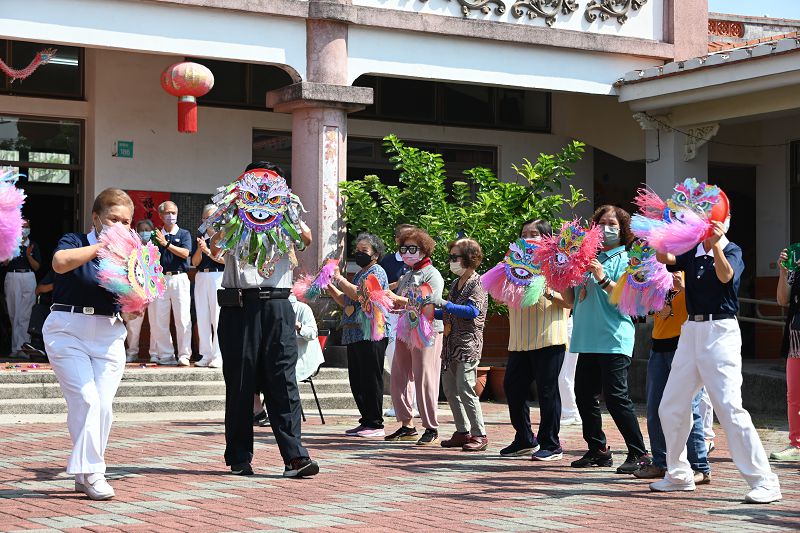 「三嬸婆仔看熱鬧喔!歡喜甲笑哈哈;三叔公仔拿著拐仔頭啊!看甲嘴仔里西西⋯⋯」社區長者人手一盆獅頭,一起手舞足蹈來跳〈弄獅〉,為據點揭牌增添熱鬧喜氣,每個獅頭都是獨一無二自己彩繪成果。據點長者吳永淼雖然已經七十五歲,動作靈活走在前面帶動,平時跟太太一起來據點學習,覺得來這裡獲得心靈寄託真的很好。