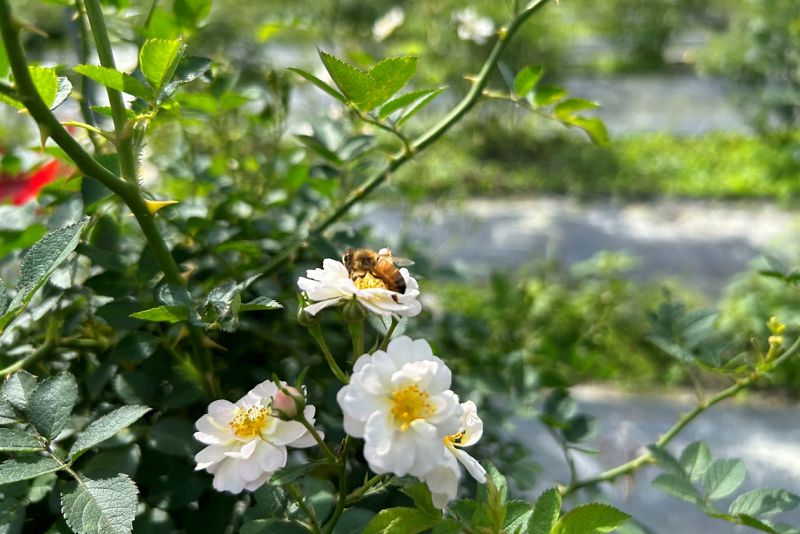 月亮玫瑰,又名「食用小玫瑰」,它豐厚的花蜜,是藥草園小蜜蜂的最愛。證嚴上人教導弟子,應於日常生活中學習慈悲一切眾生。因此,當志工菩薩們摘花遇到蜜蜂採蜜,即便要禮讓蜜蜂,也不能錯過任何一朵花朵;珍惜每一朵花,也珍惜在人群中造福增慧,這就是「無餘修」。