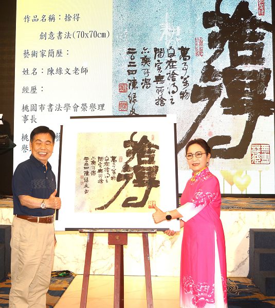 【記者吳惠民桃園報導】國際崇她桃園社第第十三屆、第十四屆社長交接典禮,日前在皇家薇庭婚宴會館盛大舉行,席開15桌,嘉賓雲集。由該社社員各種歌舞表演外,尤其令人矚目的是即將遠赴澳洲參加國際年會表演的31區美麗的薩克斯風樂團演奏,贏得全場如雷掌聲!此外多幅書畫藝品義賣也引起極佳回響競價爭標,袁金塔老師畫作《葉魚》以30多萬售出,桃園書法教育學會榮譽理事長陳綠文《捨得》書法也義賣5萬元,義賣所得全將作為公益捐助使用。會中並進行方舟啟智教養院、失親兒福利基金會社服捐贈。
