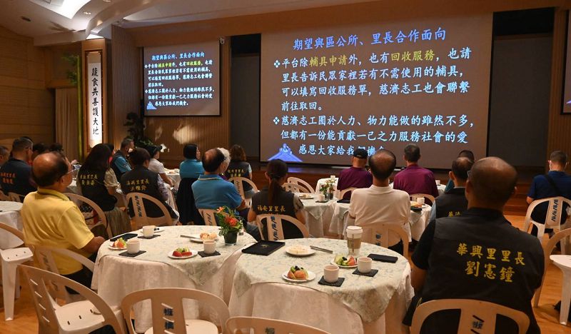慈濟基金會活化靜思堂等各道場,善用功能與良能空間,設置「環保輔具平臺」,為使輔具循環再利用效益提升,及提供有需求的里民申請,日前,慈濟板橋園區邀約新北市板橋區的里長們舉辦使用說明會。板橋區陳奇正區長、民政局吳政宏局長特地撥冗指導,與會的里長聽取輔具申請細節後,表示會將訊息帶回里內,提供有需要的里民在惜物循環的理念下,透過平臺申請需要的輔具,讓輔具成為社區老人家最好的生活輔助器具。
